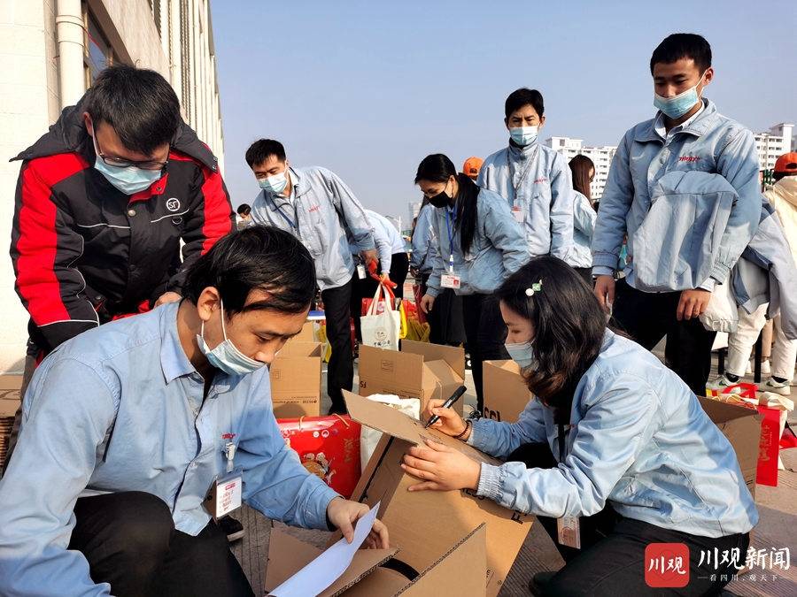 2月1日,在眉山信利高端显示科技有限公司,留岗过年的员工正在邮寄春联、福字和礼包。
