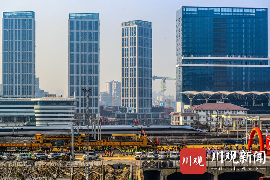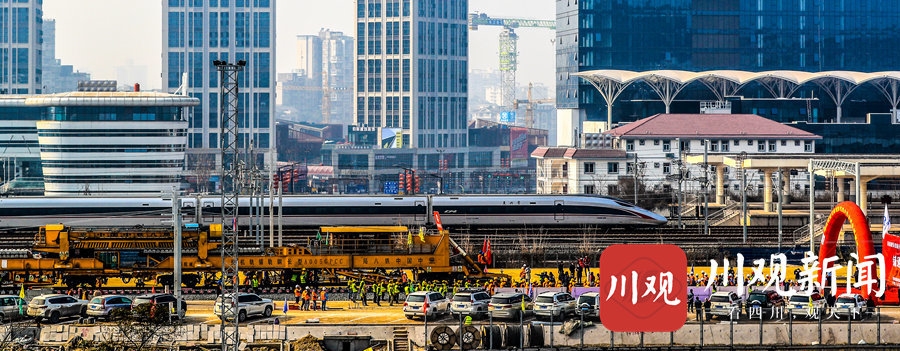 2月1日,川南城际铁路内自泸线内江北站处,长钢轨铺轨机组正在铺轨,与呼啸而过的成渝高速铁路“复兴号”同框。