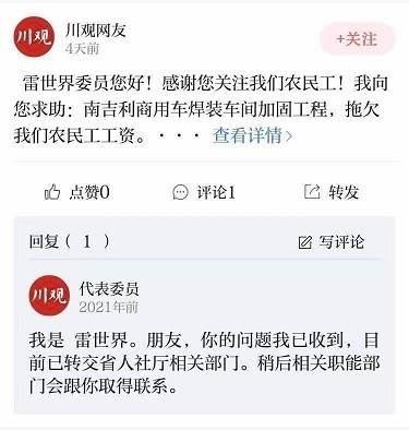 江先生的留言当天通过“你点题,我代言”活动“抵达”雷世界委员手上。很快,雷世界委员向四川在线记者了解了相关情况及网友联系方式,随后,他表示已将江先生和另一位讨薪网友的求助转发至省人社厅相关部门。