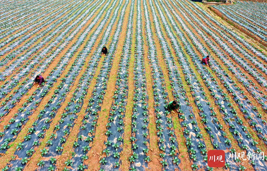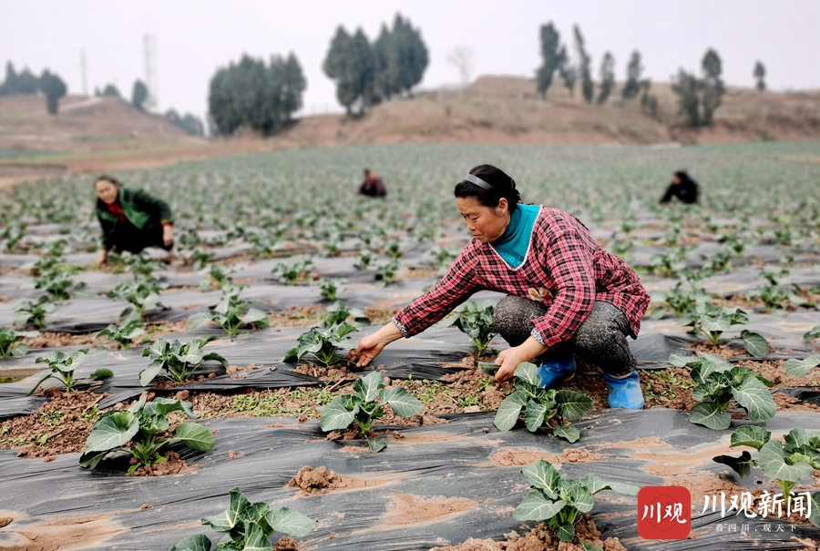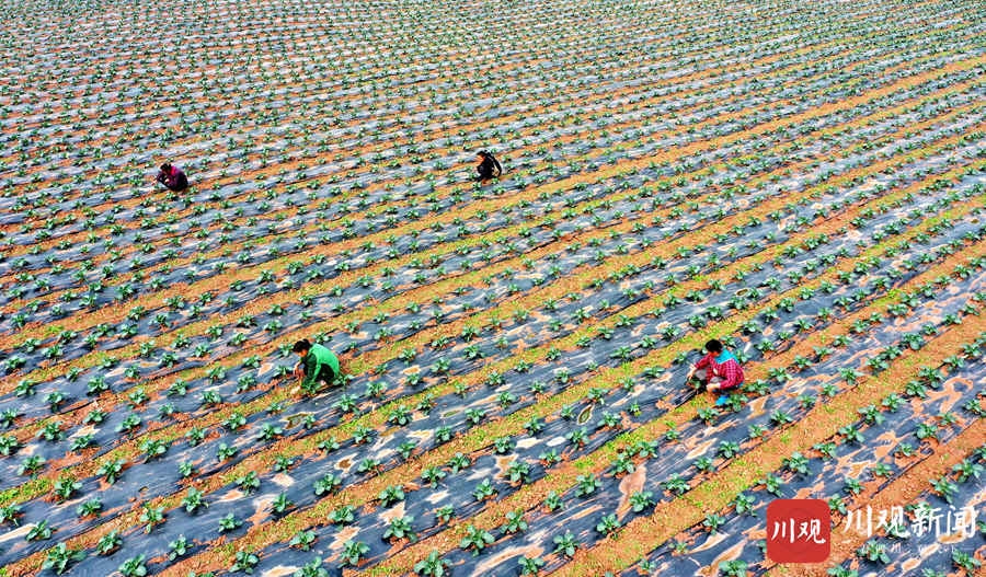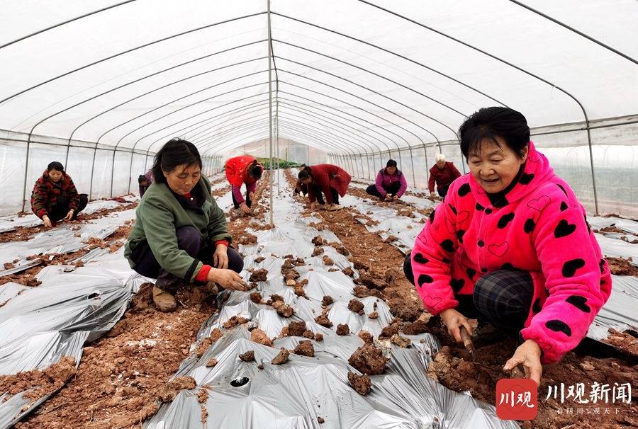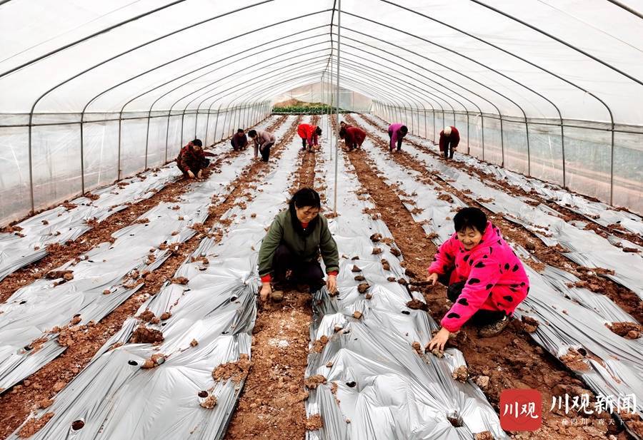 仁寿县现代农业产业园区,村民们正在进行地膜覆盖育种。