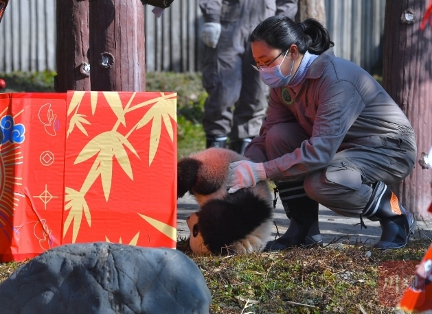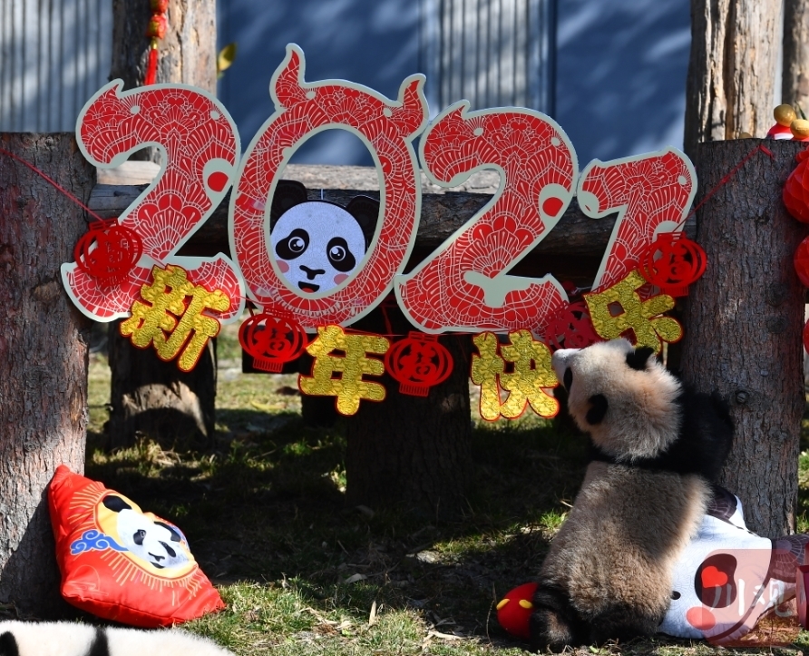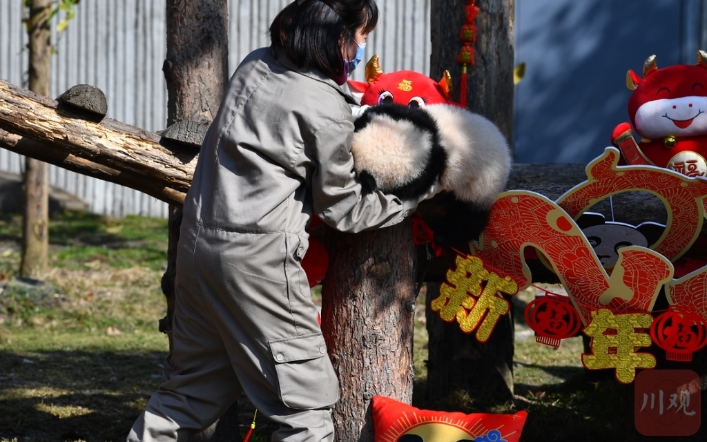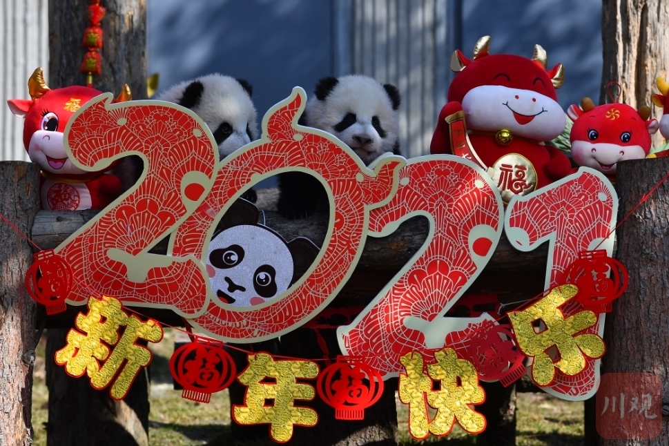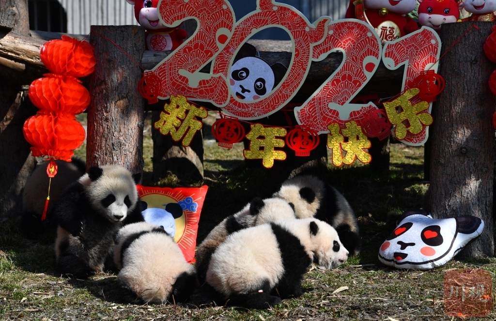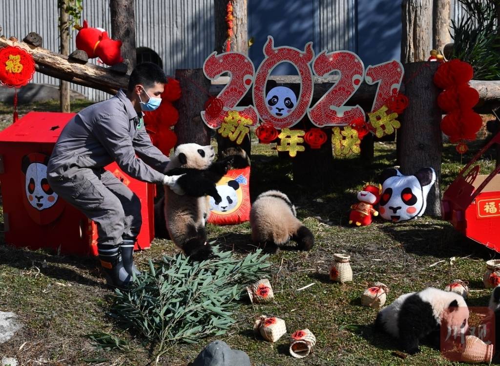 2021年2月3日立春之际,中国大熊猫保护研究中心10只2020级熊猫宝宝亮相卧龙神树坪基地,向全国人民送上新春祝福。上午11点,奶爸奶妈们抱着10只熊猫宝宝走进幼儿园运动场,向全国人民送上最萌的新年祝福。随后,奶爸为熊猫奶妈们将这群好动的熊猫宝宝们放进了贴有熊猫图案的“新年萌盒”内,让大家隔着屏幕都能感受到“拆萌盒”时“你的小可爱”突然出现的惊喜。奶爸奶妈们还贴心的为每只熊猫宝宝准备了贴有福字的“竹篓红包”,里面装有熊猫宝宝可以吃的小零食,同时也寓意把好运和祝愿送给他们。