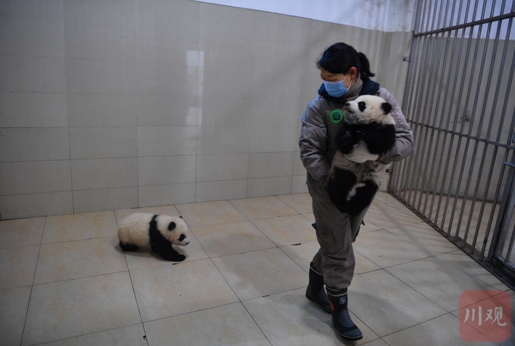 熊猫中心大熊猫专家张贵权介绍,“2020年,我们严格按照大熊猫繁殖配对系数,根据大熊猫发情情况,科学合理地推进繁殖工作,所有大熊猫均是自然交配。幼仔出生后,少数母兽带仔经验较差,需人工育幼四个月后还给母兽,现在幼仔均由母亲哺育。今年,我们熊猫中心繁育成活幼仔25只,今天亮相的熊猫宝宝只是其中的一部分,亮相结束后,我们会及时将这些宝宝还给妈妈。”