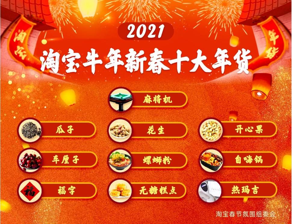 2月3日,记者从淘宝获悉,淘宝日前发布牛年春节十大爆款年货,除了瓜子、花生、开心果老三件,还有车厘子、自嗨锅、螺蛳粉等网红新年货,家用麻将机更是成为春节氛围担当。