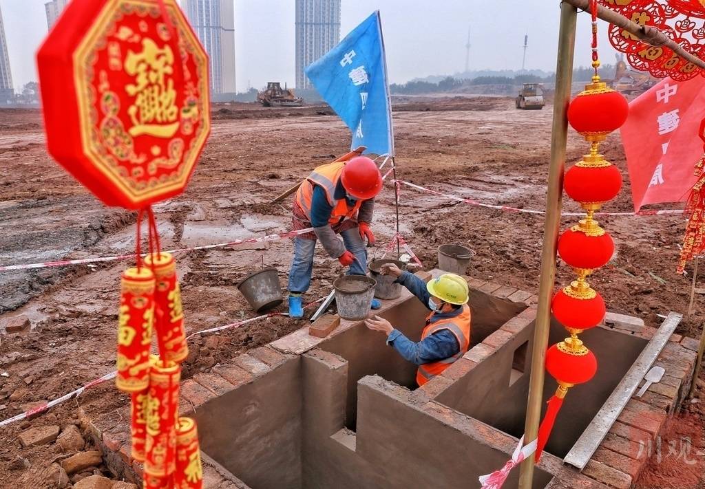 2月3日上午,在泸州市龙马潭区鱼塘街道的龙马高中在建工地正大门处,大红灯笼高挂,中国结和一连串的金色福字排排相连,搭配着施工场地内挖掘机的摩擦声,钻孔机的“咚咚”声,给这片嘈杂荒凉的黄色土地增添了几分热闹感。