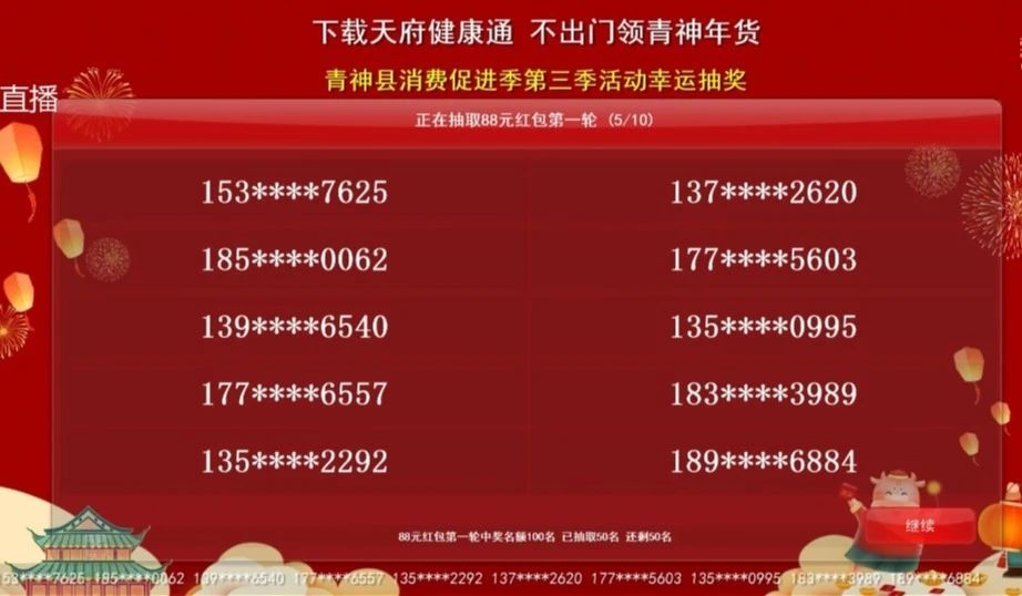 预计到2月10日,青神县将针对已注册“天府健康通”用户定向发放60万元消费券,全面推进“天府健康通”注册工作。2月1日-2日,全县通过“直播抽奖”和“线上抽奖”两种渠道,已发放消费券2321张,其中包括8888元消费券1张,888元消费券20张,88元消费券300张,8.8元消费券2000张,总金额达70648元,促进了餐饮、零售、医药、农资等行业消费60万元以上,实现提振消费和健康码注册双赢。