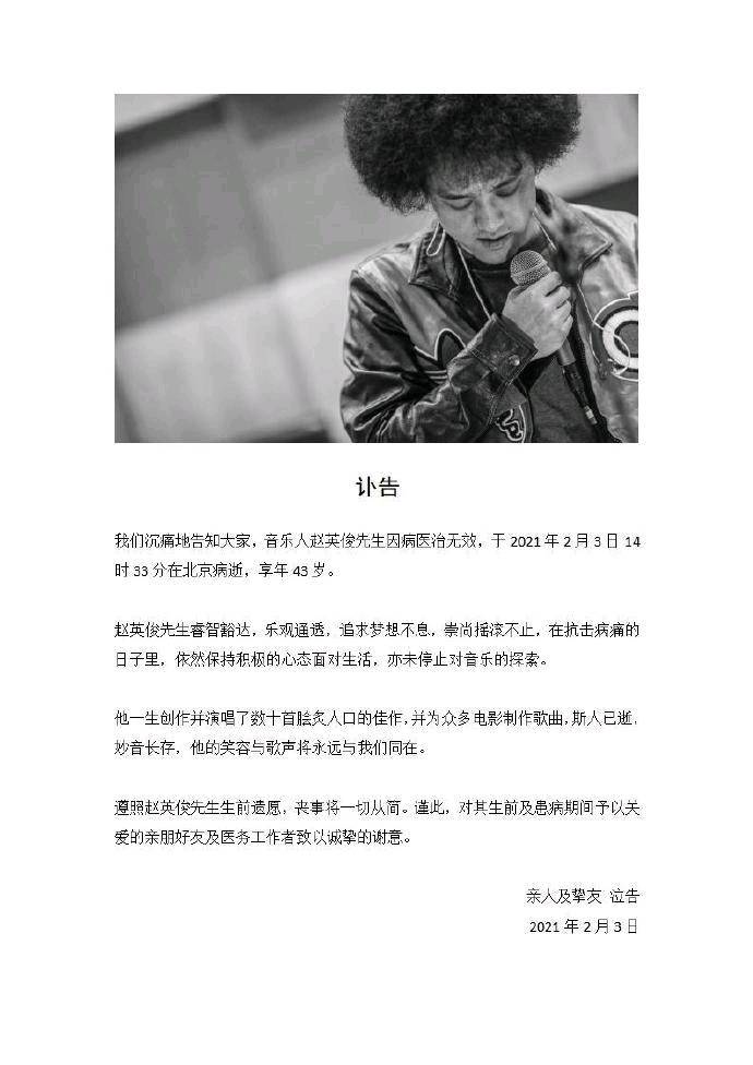 2月3日,赵英俊家人发表讣告,称赵英俊因病医治无效,于2021年2月3日14时33分在北京病逝,享年43岁。2月3日晚八点,赵英俊的微博@赵英俊是潇洒哥 更新了赵英俊生前写好的小作文。