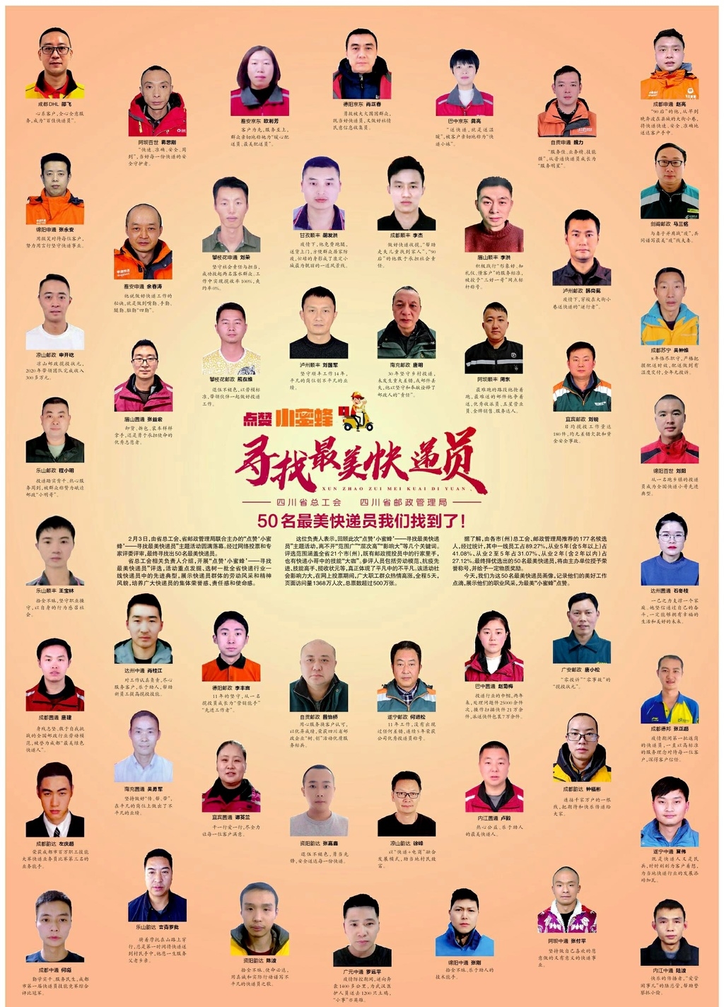 2月3日记者从省总工会获悉,由省总工会、省邮政管理局联合主办的“点赞‘小蜜蜂’——寻找最美快递员”主题活动圆满落幕。经过网络投票和专家评委评审,最终寻找出50名最美快递员。