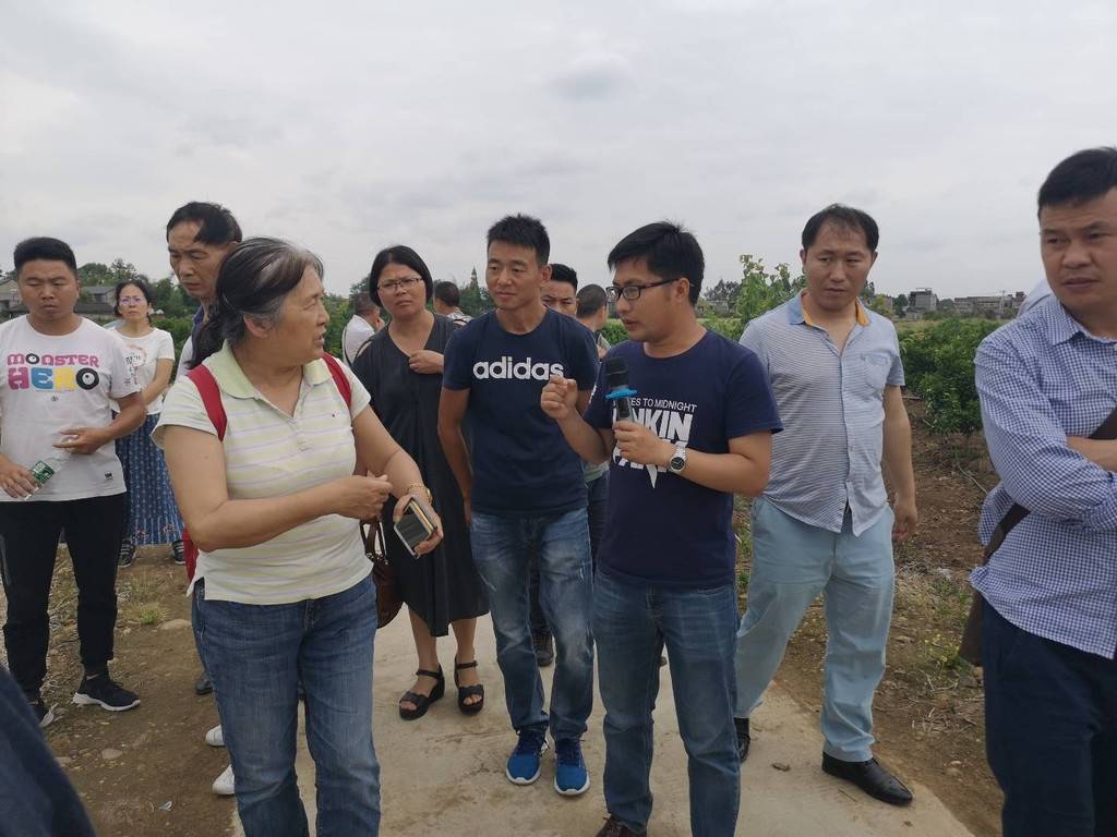 刘沈厅(右三)正在为前来考察的客人介绍农场发展情况
