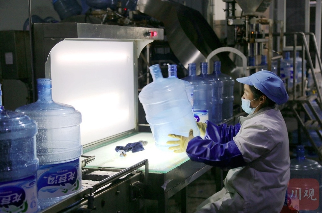 从山上往下走,来到牛背清泉企业生产车间内,机器高速运转,工人各司其职,装水、封瓶、贴标……一整套工艺流程下来,一袋袋、一瓶瓶、一桶桶天然山泉水经过滤、杀菌、灌装、包装等环节后,呈现在大家眼前。