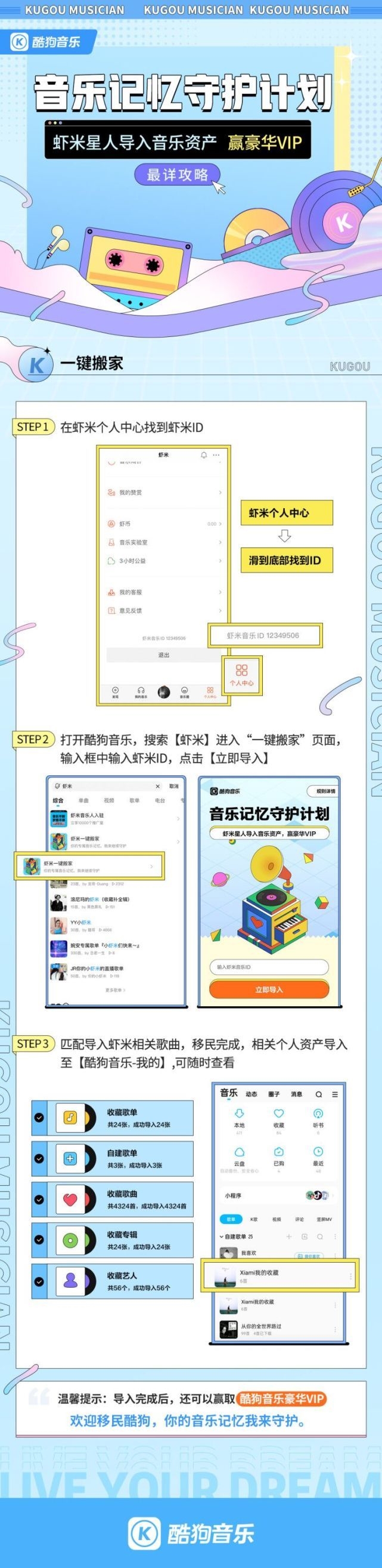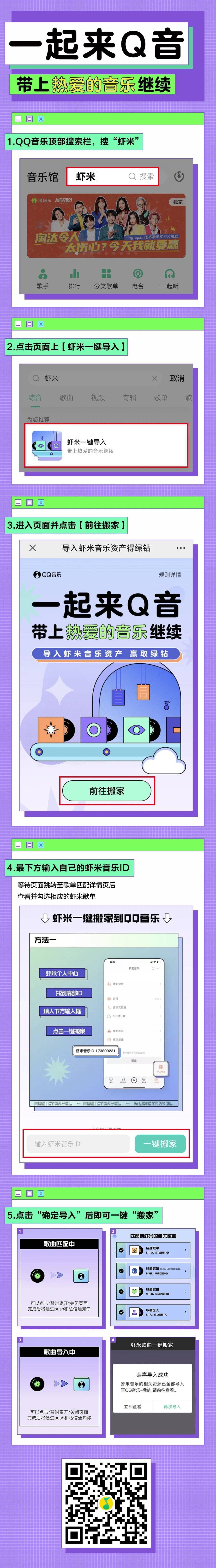 转移方式:扫描海报二维码,直接输入虾米数字ID号(虾米ID号在个人中心的最下方的),完成最近收听、已创建歌单等资产进行一键转移,转移过程中用户还有机会抽得该平台的白金会员。