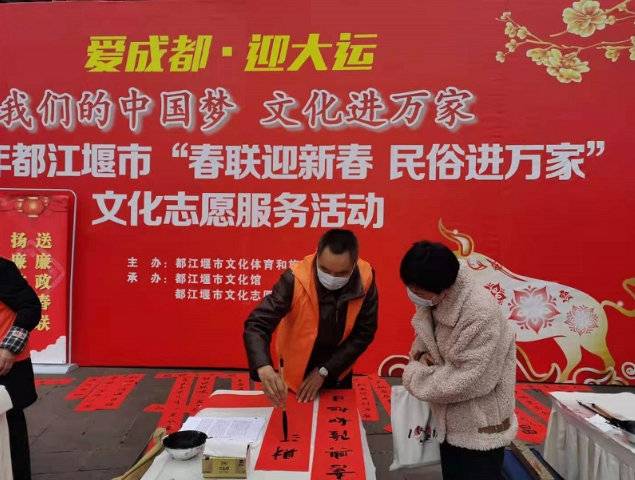 据了解,都江堰市文化体育和旅游局、文化馆等单位近期还将继续组织文化志愿者深入村(社区)、企业等开展送春联、贴春联活动。春节期间,该市也将陆续举行“非遗过大年 文化进万家”新春非遗图片展、“非遗过大年 民俗闹新春”线上展播、书香新春阅好礼——线上阅读打卡等一系列迎新春活动。