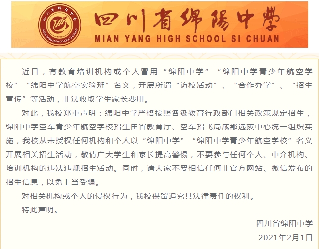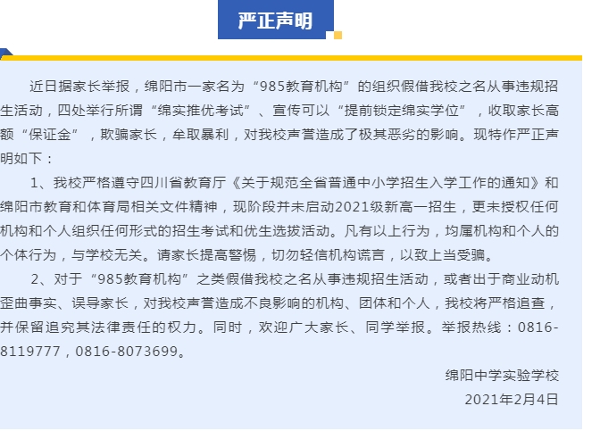 与此同时,2月4日绵阳中学实验学校针对该市一家名为“985教育机构”的组织假借该校之名从事违规招生活动特作严正声明。