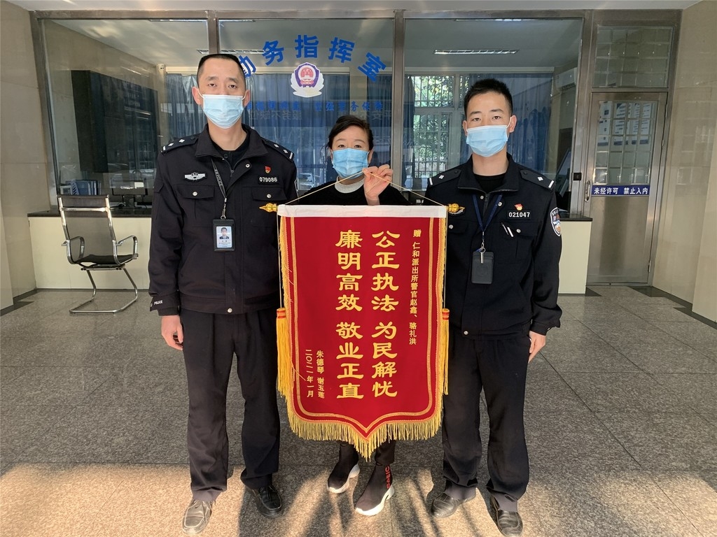原来,不久前朱女士15岁的儿子和邻居因为小事发生摩擦,造成对方轻伤,仁和派出所民警赵鑫和骆礼洪调解纠纷后,把孩子叫到一旁,耐心进行了教育。“我们只是在执勤中做了一件非常小的事情,没想到对方送来了锦旗,还带着工具热心想帮我们挂上墙,非常温暖。”赵鑫说。