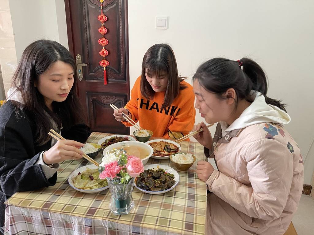 “菜齐了!来,开动!”端上精心准备的最后一道菜,钱梦珍轻松地落座,和两位“小姐妹”——赵月、王永敏开心地用起餐来。