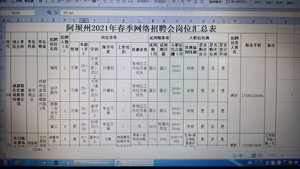 经过精心筹备,阿坝州2021年春季网络招聘会共征集审核参会招聘企业56家(国企9家,人力资源服务公司2家,工业园区2家,民企43家),提供招聘岗位266个(适合大中专毕业生岗位159个,适合普工岗位107个),拟招聘1502人(拟招聘大中专毕业生587人,普工915人)。