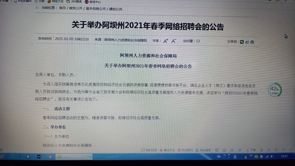 2月5日,记者从阿坝州人力资源和社会保障局获悉,今日开始,阿坝州春季网络招聘接受报名,1500余个岗位等你来选。