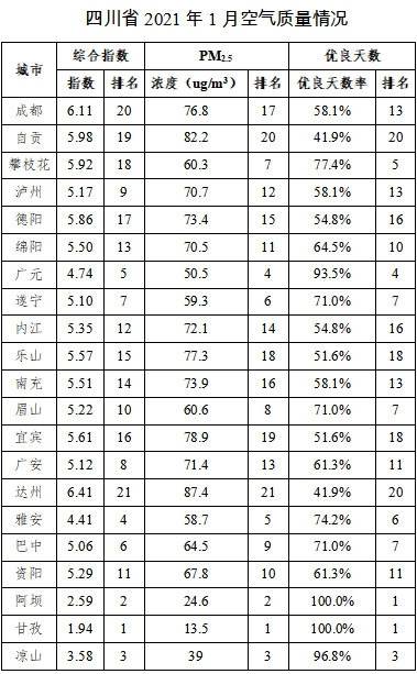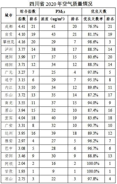 2月7日,四川省生态环境厅通报了2020年和2021年1月全省各市州空气质量状况。根据通报,去年甘孜州和阿坝州的空气质量优良天数率为100%,并列全省第一,而成都市和德阳市的空气质量优良天数率,则排名最后两位。