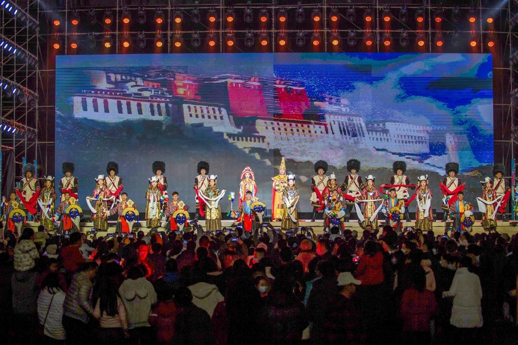 夜幕降临,“新春大典•蓉城乐梦”盛世和美联欢音乐会震撼登场,喜庆的欢歌、热情的火把舞、奔放的锅庄等国风美韵与特色歌舞表演交织呈现,在欢乐祥和的气氛中献上一场盛世和美的新春音乐盛宴。当晚压轴上演的经典史诗剧作《文成公主》选段,由域上和美拉萨演出团队跨越高原奉献天府,于蓉城再现恢弘的艺术盛典。穿越千年的“文成公主”和“松赞干布”携手歌唱汉藏和美的动人传奇,期间藏戏、果卓舞、打阿嘎等经典非遗表演,更引发现场喝彩不断。