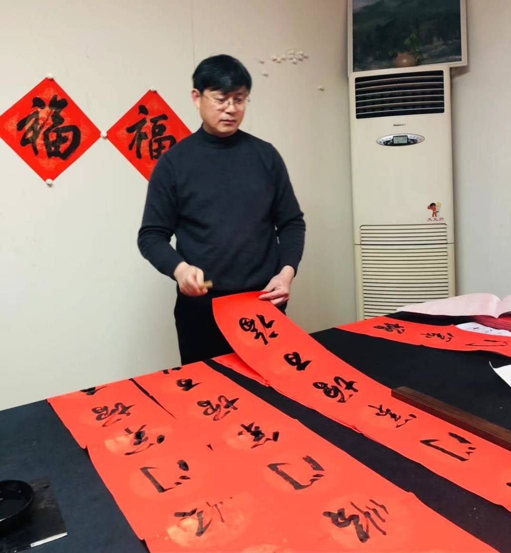 大红春联排排挂、喜庆福字附满桌。2月6日,由川观新闻、省文学艺术界联合会、省文艺志愿者协会多方联手,在省文联党组副书记、副主席、省文艺志愿者协会主席李兵,以及四川省文艺志愿者协会秘书长、四川省文艺家维权中心主任虎绍平的组织下,代明道、王兴国、李家德、吕楠、钟杨琴笙等5名中国书法家协会会员,以及成都市书协会员罗华明集结在钟杨琴笙书法工作室,名家们用整整一天时间,书写完成200副春联及200个福字,作为赠予川观新闻读者的春节福利。
