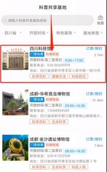 3.找到“四川科技馆”,点击右上角“订票/预约”,进入预约页面。