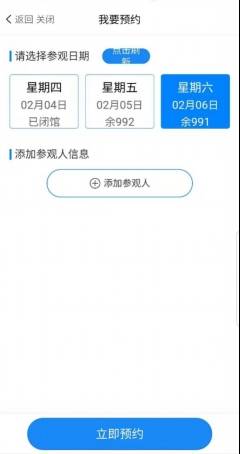 依次选择:我要预约→选择参观时间(可预约未来三日的参观名额)→添加参观人(输入姓名和身份证号)→立即预约→预约成功(同一账号一个参观日最多可预约两个参观名额,儿童也需预约)