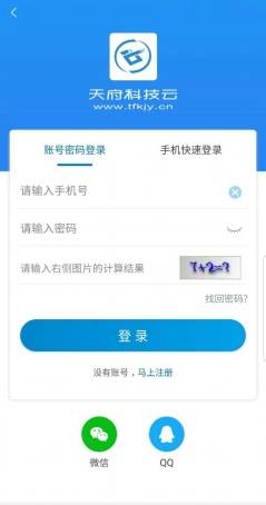 1.扫描二维码下载并安装“天府科技云”APP,注册天府科技云账号并登录。