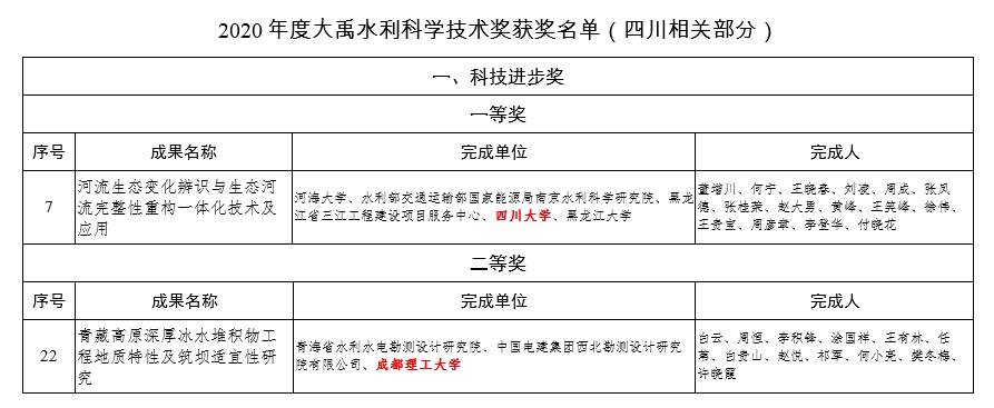 其中,由四川的两所高校参与完成的成果获得大奖。一个是,四川大学参与完成的“河流生态变化辨识与生态河流完整性重构一体化技术及应用”获得科技进步奖一等奖;另外一个是,成都理工大学参与完成的“青藏高原深厚冰水堆积物工程地质特性及筑坝适宜性研究”获得科技进步奖二等奖。
