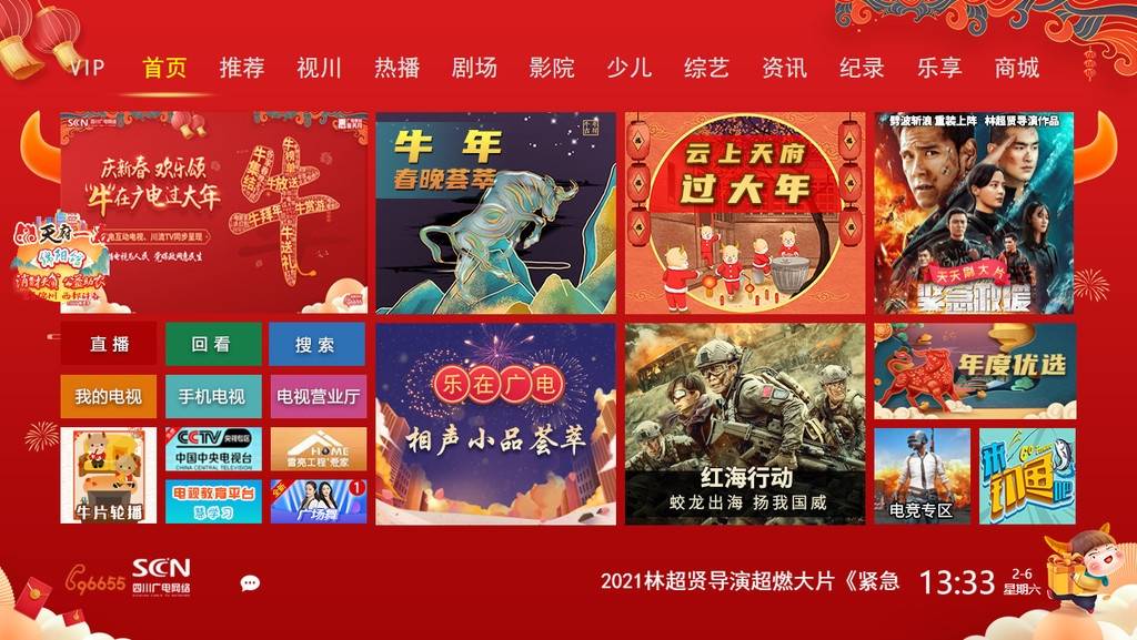 据介绍,四川广电网络精心策划的互动电视首页新春点播专区已全新上线,各类新春主题内容海量聚集,主要包括集成21个频道春晚和历年春晚相声小品集的“牛年春晚荟萃”,打造超强春晚专区;利用广电网络平台数据能力,将最热春晚、歌手、相声小品、戏曲、好剧好片等进行排行的“广电牛榜”;大年三十至初六,结合年味及年俗,每天推荐更新主题大片的“春节七天乐”专题;还有根植本地、集合省文旅厅文化云展播、好看宽屏短视频、旅游景区慢直播、家庭春晚短视频大赛四大板块的“云上天府过大年”活动专区,大家足不出户,打开电视就能看景区、参加家庭春晚短视频大赛。