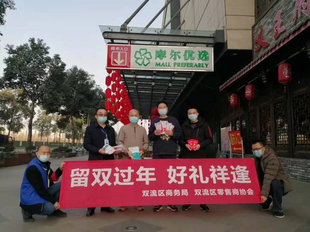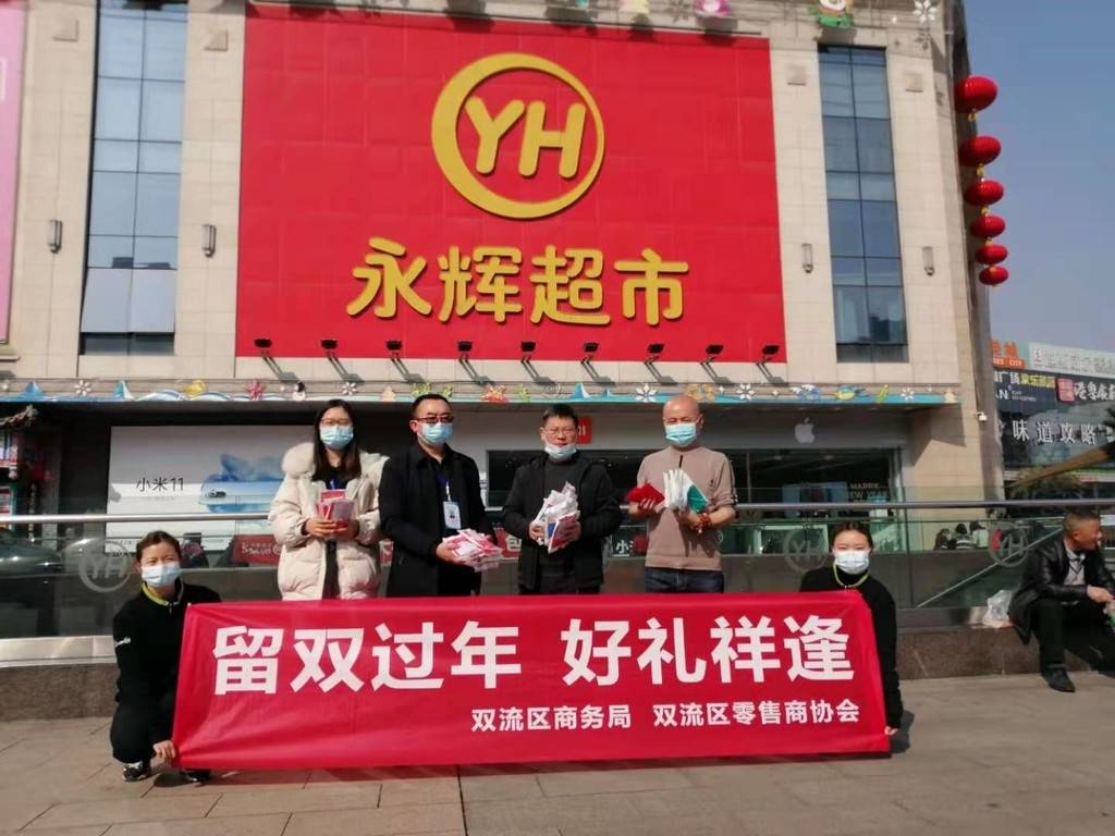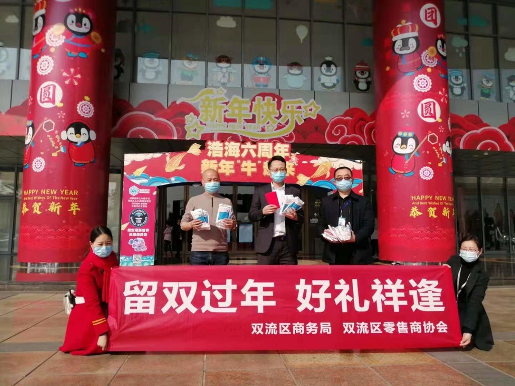 “今年春节期间,因为疫情的影响,留在双流过年的群众将增加很多,商场的员工们坚守岗位辛苦工作,我们送来一些防疫用品,表示我们的一点心意!”春节即将到来,2月8日,成都市双流区商务局携手区零售商协会开展了“留双过年 好礼祥逢”全区大型商场超市2021年春节慰问品发放活动。