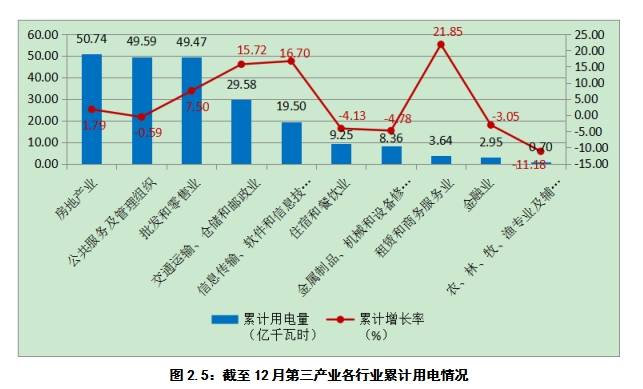 第三产业,租赁和商务服务业累计用电同比增速最高,为21.85%。从数据分析可看出,成都市信息产业、交通运输业发展向好。新冠肺炎疫情爆发后,房地产业、住宿餐饮业等均不同程度受到影响,第三产业累计用电增速放缓。目前,批发和零售业、租赁和商务服务业用电恢复较好。