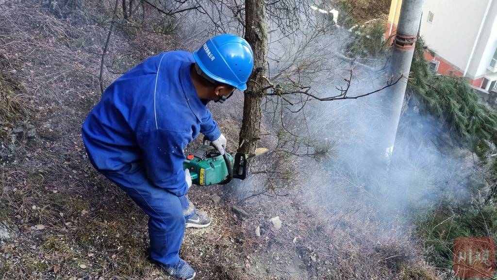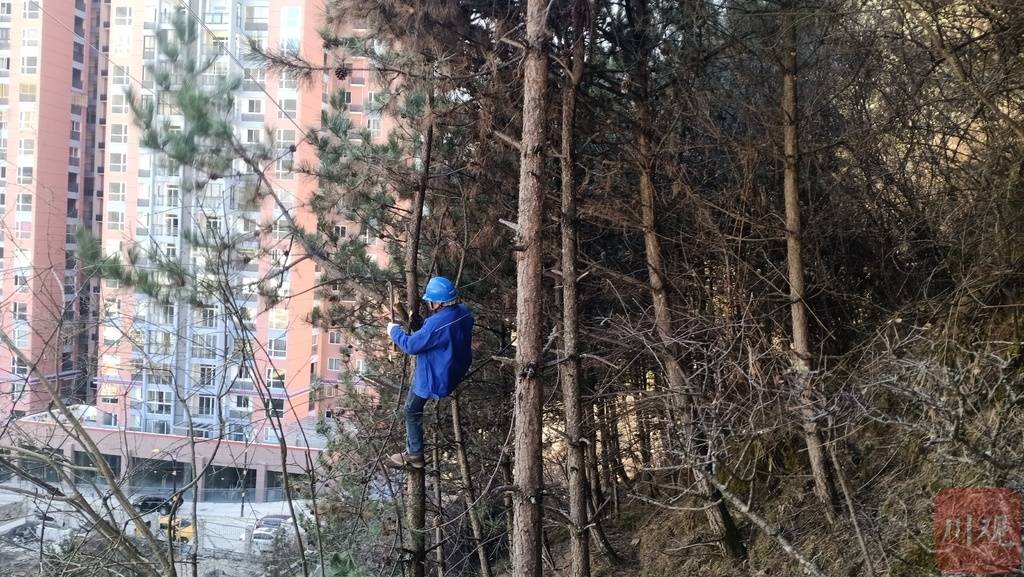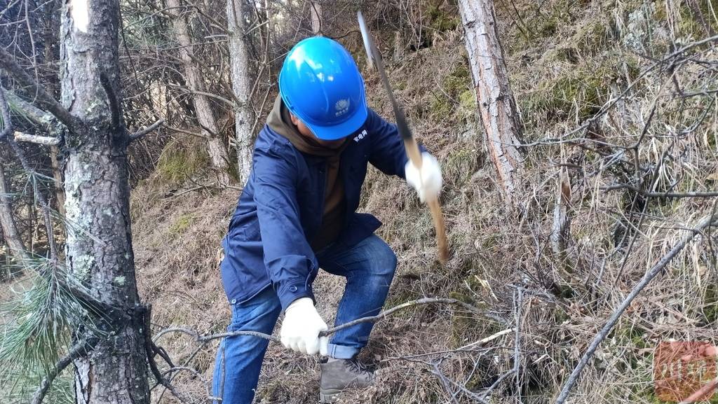 民房后边是大山,大山上是成片人造松树林,巨大的“嗡嗡”声从松树林中传出。2月8日一大早,在阿坝州马尔康市马尔康镇俄尔雅村后山上,国网四川阿坝州电力有限责任公司马尔康市供电分公司运维检修部的工作人员就在砍树清枝,他们正在开设防火隔离带。