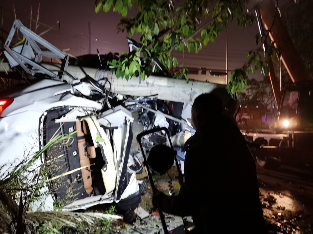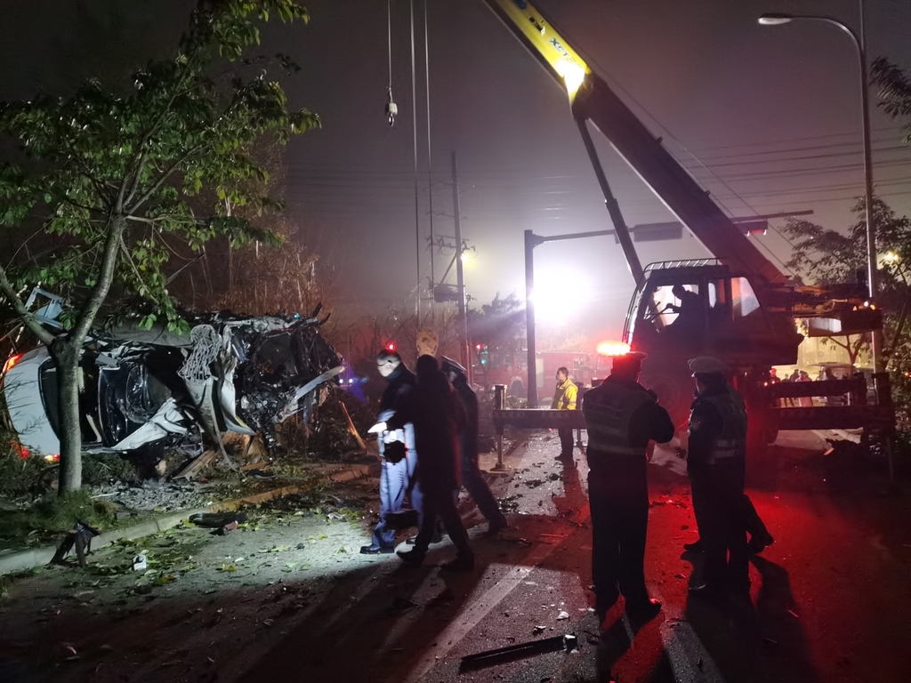 2020年12月10日,赖某某饮酒后驾驶川A4X9**号小型轿车搭乘刘某、罗某某、余霞沿双流区长顺路二段由华府大道往黄龙大道方向行驶。02时23分许,当车行至双流区黄龙大道一段与长顺路二段、国玻二路交叉路口时,车辆与人行道上的机动车交通信号灯灯杆、行道树、电线杆接连发生碰撞,车辆向右侧倾,造成车上4人当场死亡,车辆严机动车交通信号灯灯杆、行道树、电线杆、变压器受损。