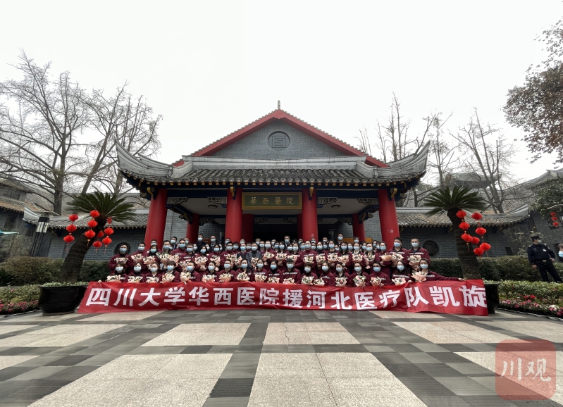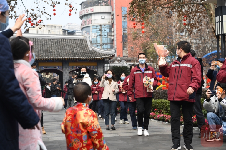 2月9日中午12时,四川大学华西医院行政楼外张灯结彩,迎接65名抗“疫”外派医疗队队员(包括支援吉林抗疫的华西医院院感专家乔甫)。至此,华西医院抗“疫”外派医务人员全部回家。新春佳节,他们终于可以与家人团聚。