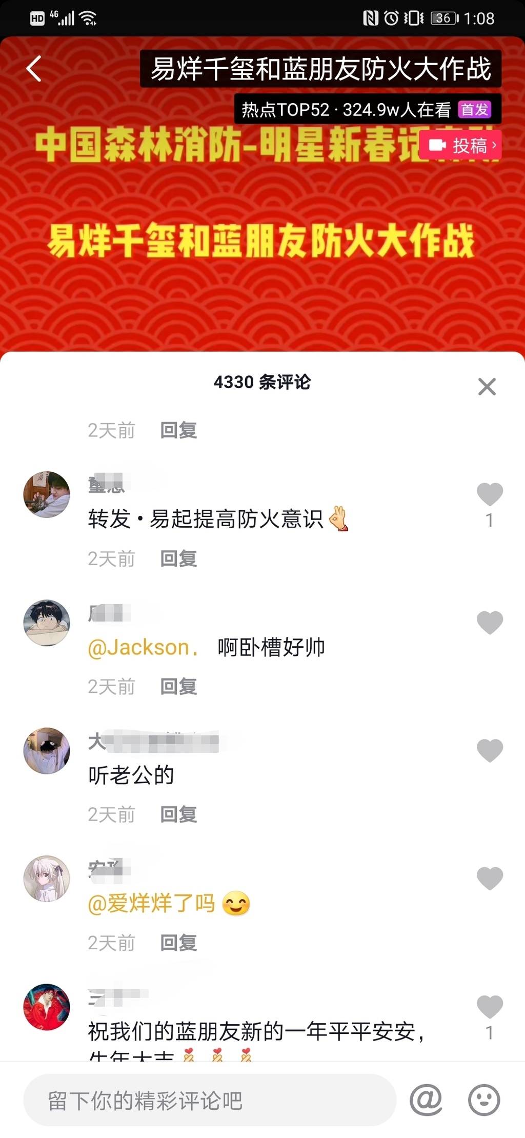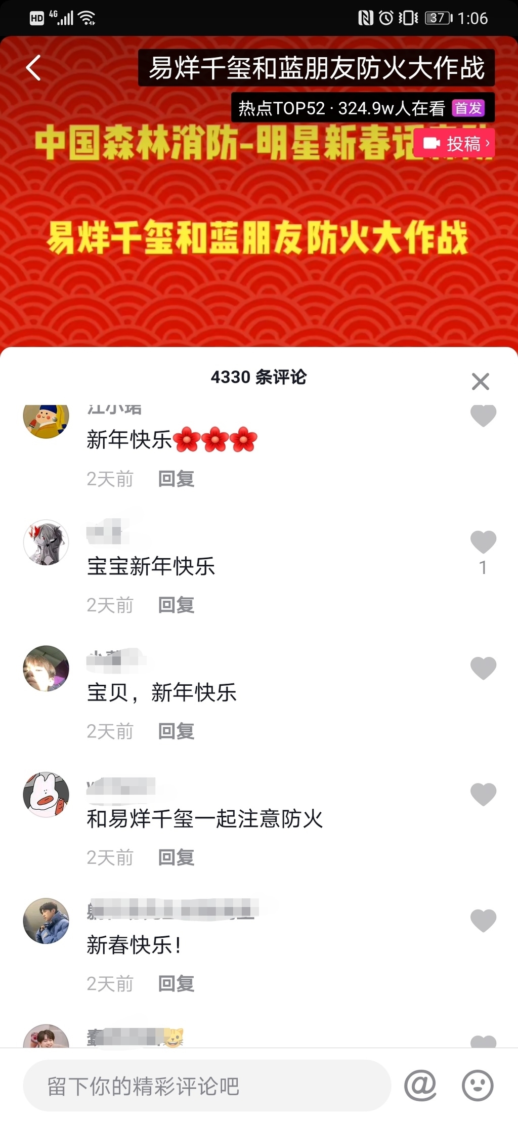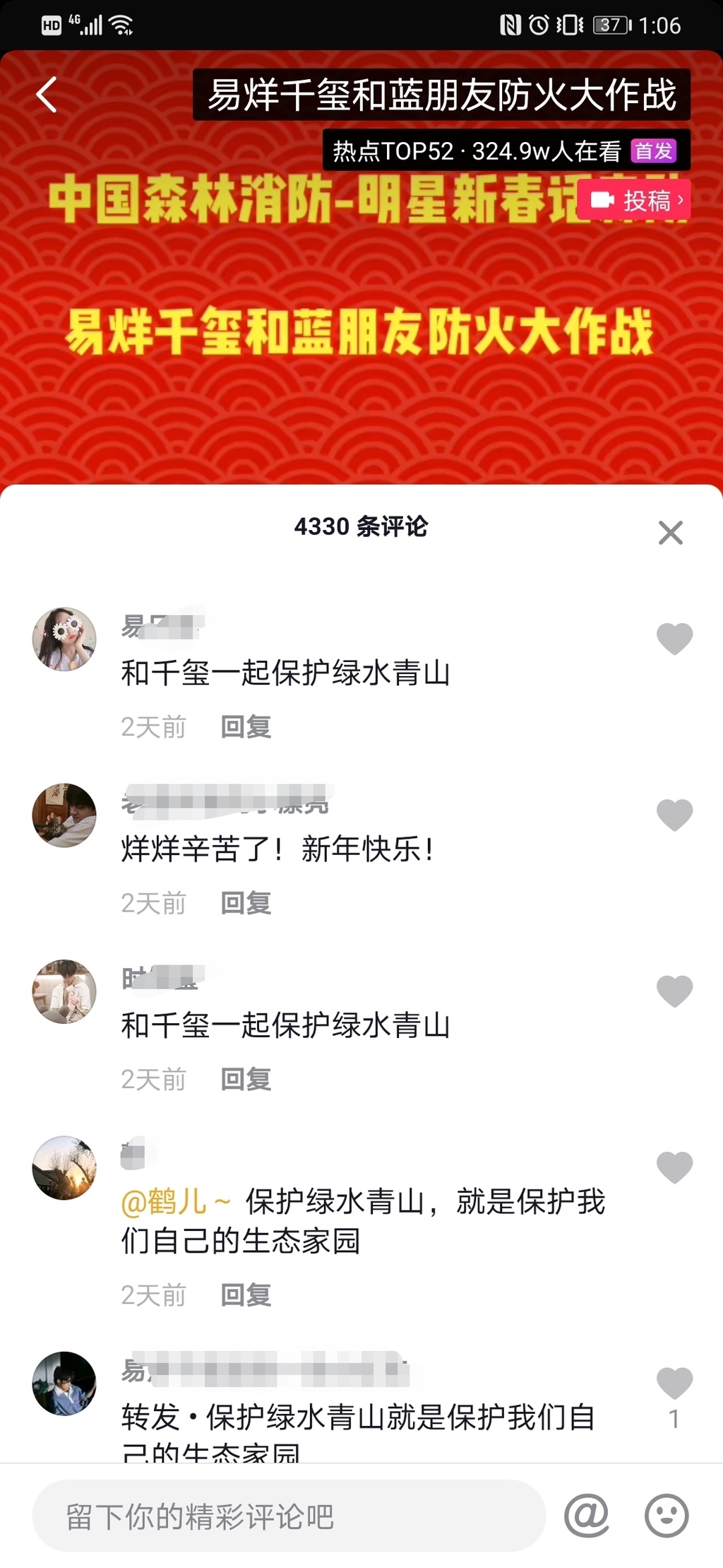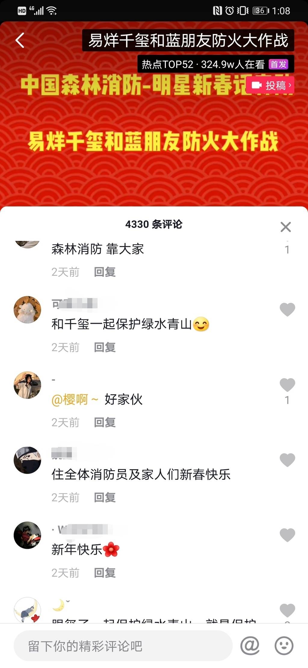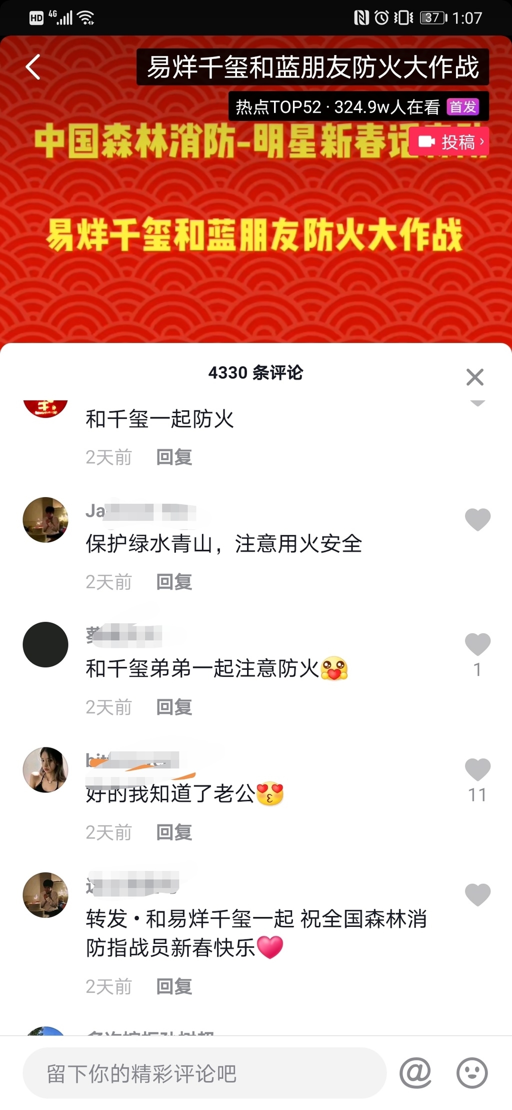 “大家好,我是易烊千玺,祝全国森林消防指战员和家人们新春快乐。提醒大家,严禁野外用火不携带火源和易燃易爆品进入林区,保护绿水青山就是保护我们自己的生态家园。”