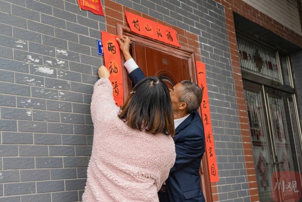 2月9日,一大早,眉山市丹棱县齐乐镇城南社区党委书记郭万军便调好了浆糊,将两对特别的春联贴在了自家的门上。