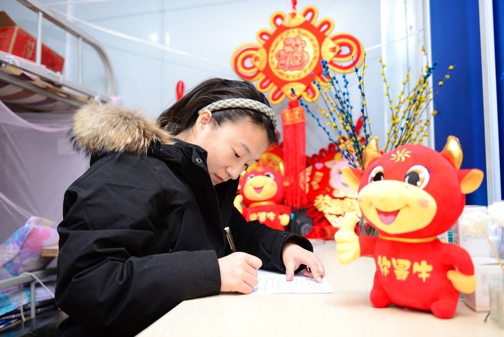 钟涵宇每天下班前都会按照惯例一一检查吊篮、各种工具是否断电,确保无误后才返回宿舍。除了生产建设忙,他还担任了职工志愿者,装扮工地、组织活动、防疫登记,虽然这是他第一次离开家乡过春节,但他觉得是一件非常有意义的事。