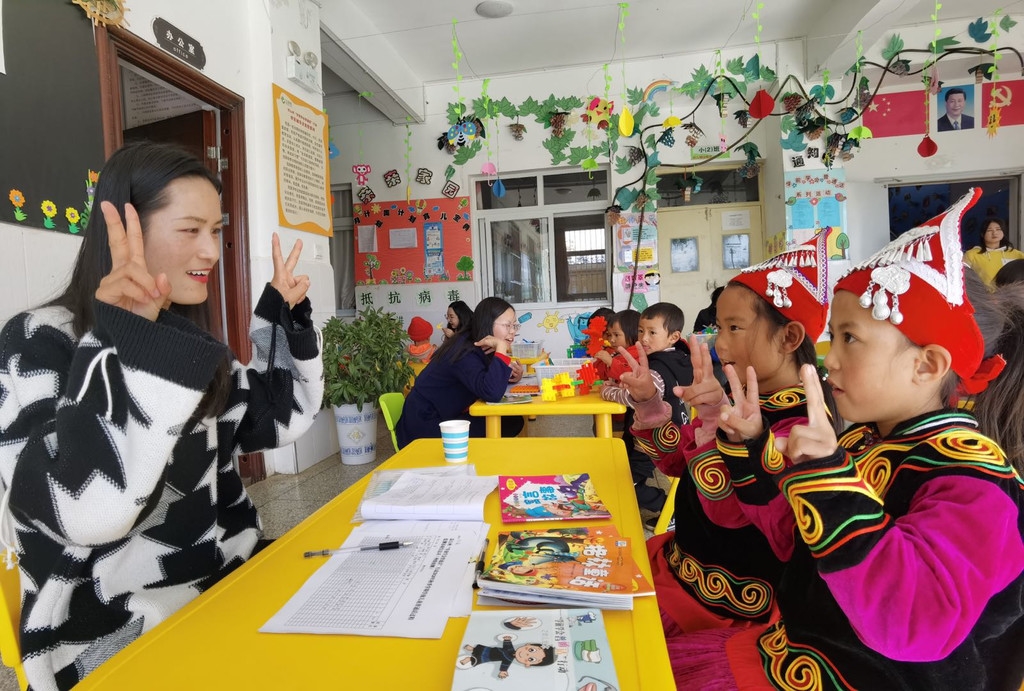 凉山州普格县特补乡乃乌村幼教点辅导员与孩子一起做手指游戏,学习普通话。