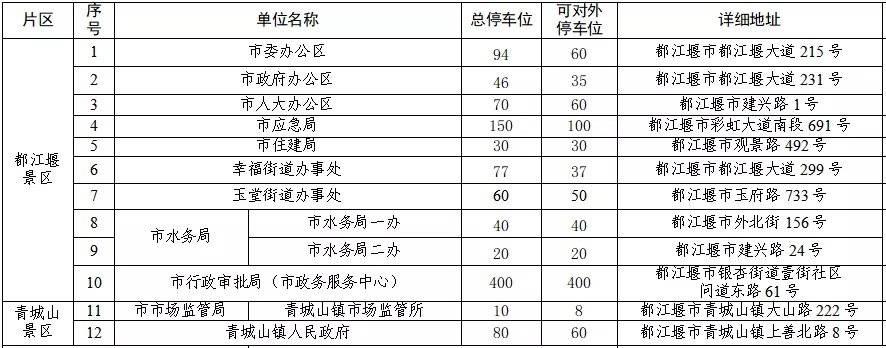 2月10日,四川在线记者从都江堰市获悉,2月11日—17日期间,包括都江堰市委办公区、市政府办公区、市人大办公区、市应急局、市住建局、幸福街道办事处、玉堂街道办事处、市水务局、市行政审批局(市政务服务中心)、市市场监管局、青城山镇人民政府、青城山镇市场监管所等12家单位办公场地的900个停车位将免费向游客开放,停车时间为每日07:00—19:00。