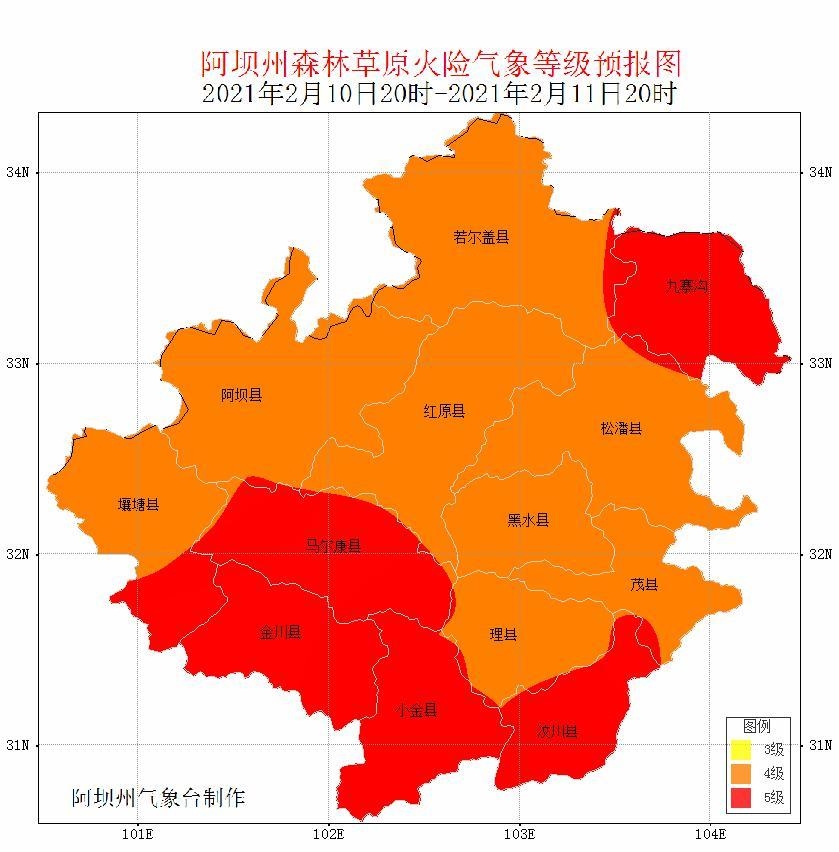 根据最新气象资料分析,预计2月10日20时至2月11日20时,阿坝州晴间多云,局地有阵雨(雪)或雨夹雪。茂县、松潘县、黑水县、壤塘县、阿坝县、红原县、若尔盖县、理县森林草原火险气象等级为4级(高),金川县、小金县、马尔康市、九寨沟县、汶川县森林草原火险气象等级为5级(很高)。