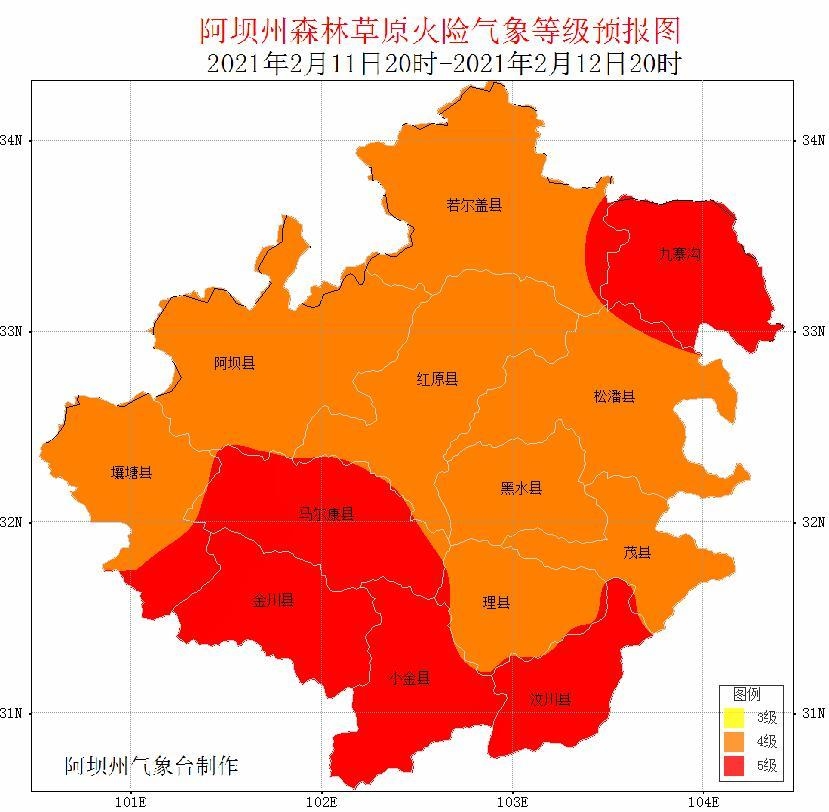 2月11日20时至2月12日20时,阿坝州晴间多云,局地有零星阵雨(雪)或雨夹雪。茂县、松潘县、黑水县、壤塘县、阿坝县、红原县、若尔盖县、理县森林草原火险气象等级为4级(高),金川县、小金县、马尔康市、九寨沟县、汶川县森林草原火险气象等级为5级(很高)。