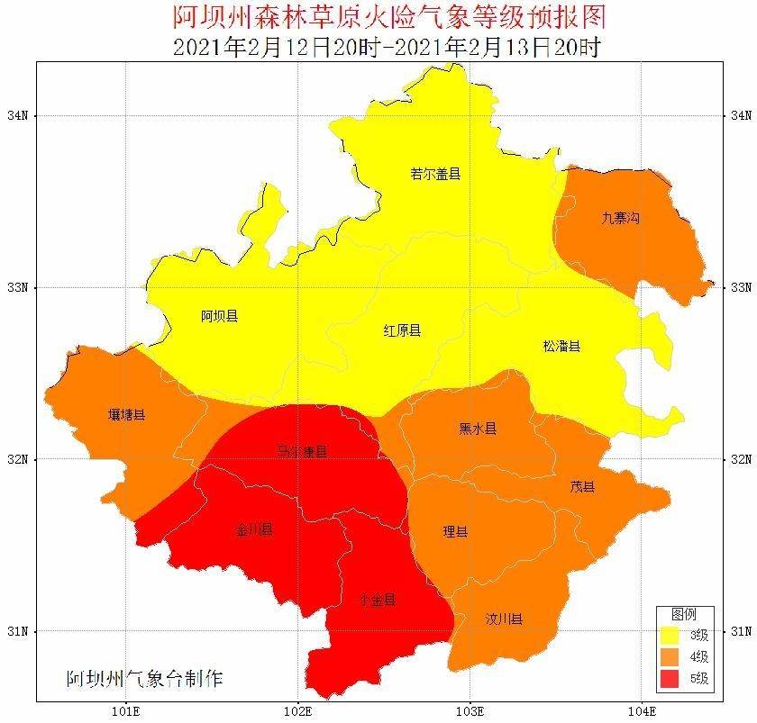 2月12日20时至2月13日20时,阿坝州多云有阵雨(雪)或雨夹雪,北部局地有中雪。阿坝县、红原县、松潘县、若尔盖县森林草原火险气象等级为3级(较高),茂县、黑水县、壤塘县、理县、九寨沟县、汶川县森林草原火险气象等级为4级(高),金川县、小金县、马尔康市森林草原火险气象等级为5级(很高)。