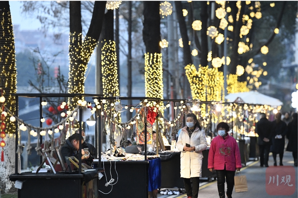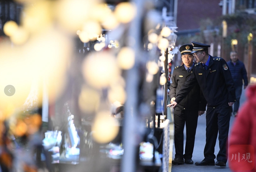 据了解,春节期间,成都市金牛区在锦江夜消费金牛段“北门里·爱情巷”户外设置了30余个集手工文创、潮流手办等各具特色的摊位。通过植入“特色场景”的方式,打造出凸显“市井时尚”的北城消费空间,引育“新北门”夜间消费模式。同时,金牛区综合行政执法局按照“户外夜经济”相关规定,对外摆商家实施划线管理,执行“一桌一桶”,保证区域内环境卫生品质不降低,综合执法队员强化巡查和督导,对不规范经营的外摆商家及时指出并督促其整改,确保节日期间市民拥有干净、整洁、有序的城市环境。