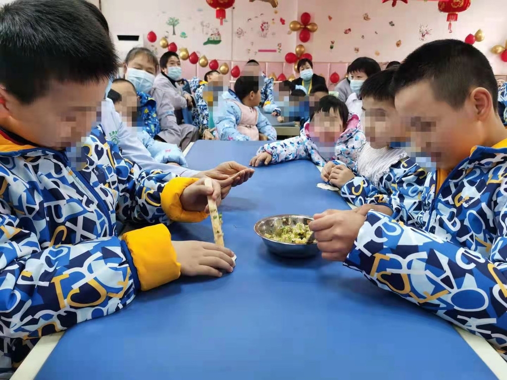 2月3日系列主题活动开幕当天,医务工作者、社工师们手把手带着孩子们揉面、擀皮、包春卷,把对春天的美好期盼包入一个个形状不一的春卷中,吃着自己做的春卷,孩子们脸上的笑容比冬日的暖阳更耀眼。