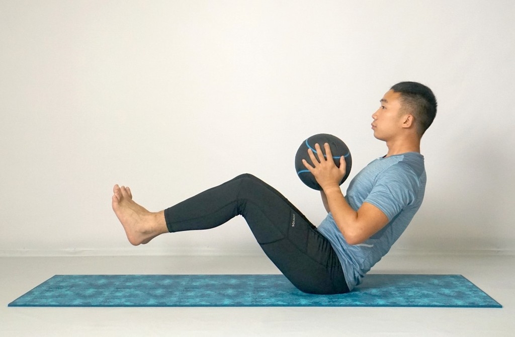 ① 坐在垫子上,双手握住药球,保持膝盖弯曲,脚跟离开地面。