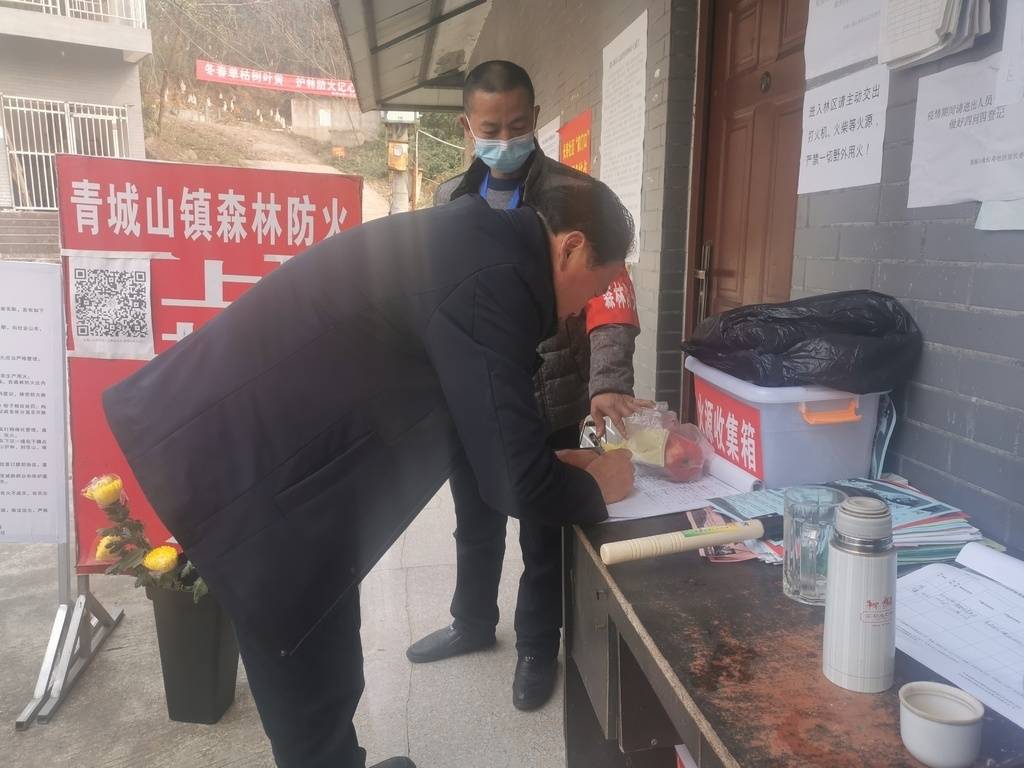 在应急管理局工作人员开展检查的同时,在青城山镇长寿社区桃花2组的一个防火检查点,当地林业检查站工作人员潘昌华正在为每一个前来上坟祭祀的村民做好检查登记工作,确保火源不进山。