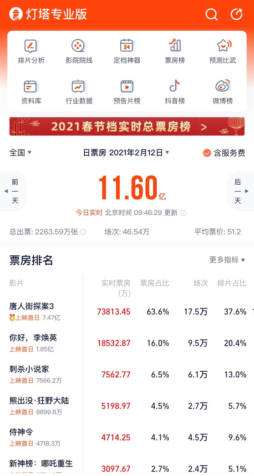 由于电影都已提前开启预售,根据灯塔专业版数据显示,截至2月12日凌晨,上映首日单日预售票房就轻松突破了10亿,其中《唐人街探案3》超过6亿,创下了国产电影上映首日预售纪录。