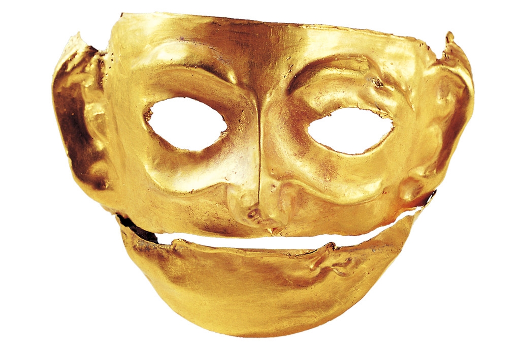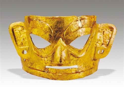 1986年,在四川广汉三星堆发现的两个祭祀坑中曾出土了6件金面具和24件铜人面具,从造型风格上看,金沙遗址出土的大金面具与之极为相似,都显得棱角分明,带有一定夸张意味,这说明了金沙与三星堆遗址有着紧密的承袭关系,金沙大金面具与三星堆金面具的制作时代应较为接近。
