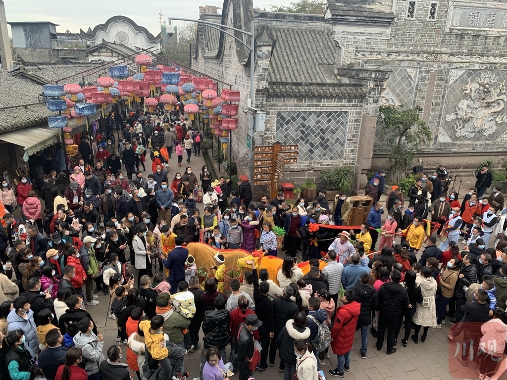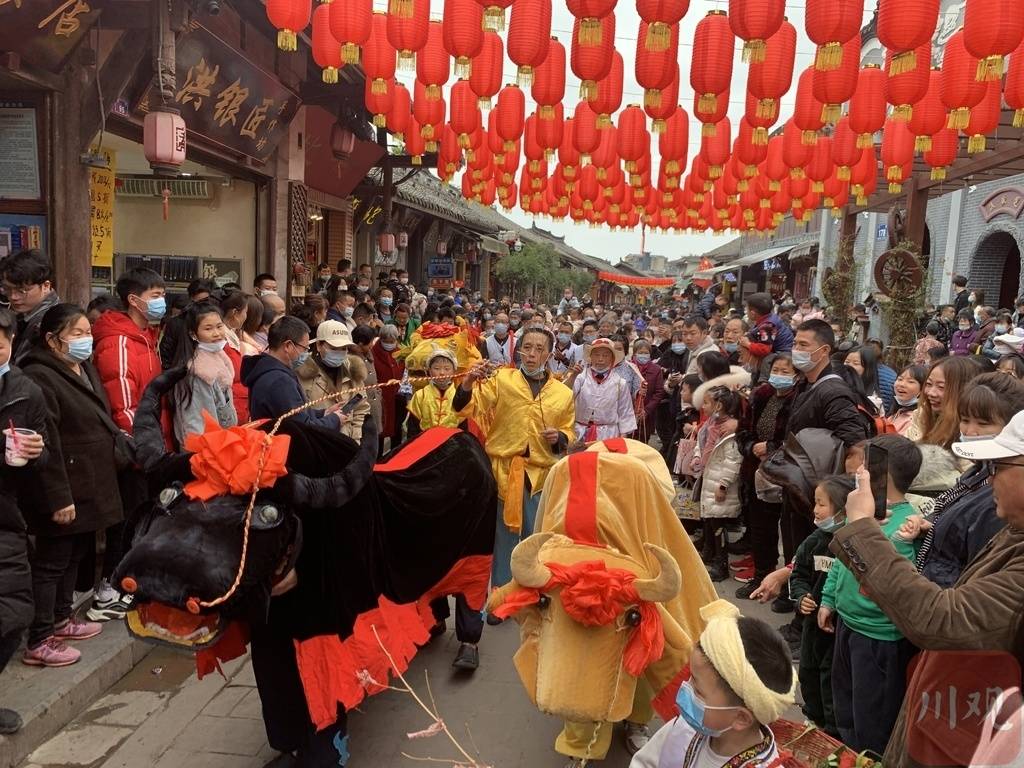 2月15日,成都市龙泉驿区洛带古镇内,两只全身似缎般光滑的“牛”喘着粗气,在牧童的牵引下在人群中行走……给牛年新春增添了不少喜庆。