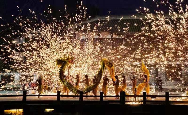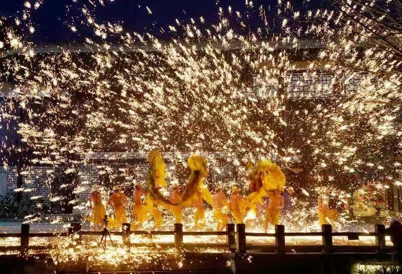 2月14日,四川省成都市双流区黄龙溪古镇的火龙灯舞再次精彩上演,为在蓉过年的人们提供了美妙的视觉大餐,让大家在火树银花的不夜天里感受到浓浓的年味儿。火龙灯舞表演将持续到2月17日,每晚一场。