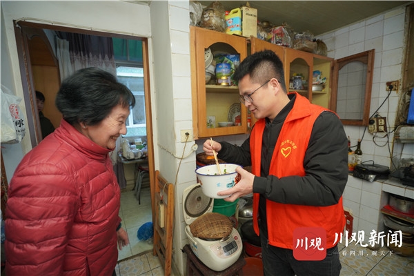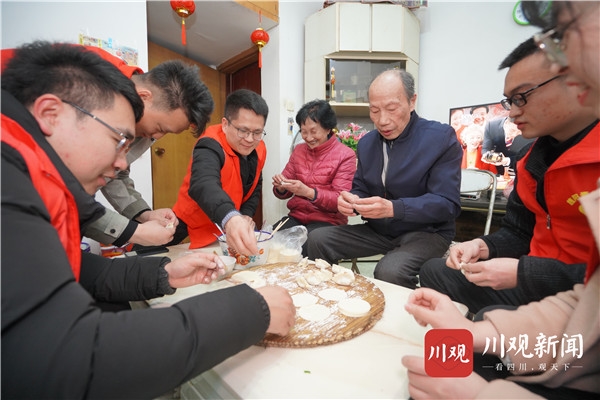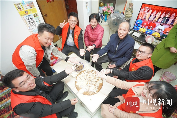 “魏爷爷,你看我这饺子包得咋样?”“陈婆婆,这是我第一次包饺子,还多担待!”2月15日一大早,四川日报全媒体“新春走基层”记者一行来到德阳市旌阳区,还未踏进采访对象魏树德位于兰花巷38号院的家门,便听到老屋里传出阵阵欢声笑语——5名青年志愿者早已来到老人家里展开新春慰问活动,大家一起搞卫生、贴福字、粘窗花、包饺子,好生热闹。